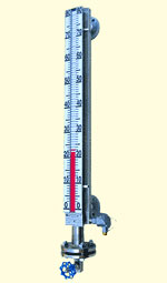 在您選用此產品前我們先將磁性翻柱液位計的工作原理作一簡單的介紹。它有一容納浮球的腔體我們稱其為主體管或外殼,它通過法蘭或其他接口與容器組成一個連通器;這樣它腔體內的液面與容器內的液面是相同高度的,所以腔體內的浮球會隨著容器內液面的升降而升降;這時候我們并不能看到液位,所以我們在腔體的外面裝了一個翻柱顯示器,因為我們在制造浮球時在浮球沉入液體與浮出部分的交界處安裝了磁鋼,它與浮球隨液面升降時,它的磁性透過外殼傳遞給翻柱顯示器,推動磁翻柱翻轉180°;由于磁翻柱是有紅、白兩個半圓柱合成的圓柱體,所以翻轉180°后朝向翻柱顯示器外的會改變顏色(液面以下紅色、以上白色),兩色交界處即是液面的高度。