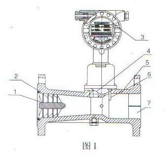 1、旋渦發(fā)生體 2、殼體 3、智能流量計積算儀 4、溫度傳感器 5、壓力傳感器 6、壓電晶體傳感器 7、消旋器