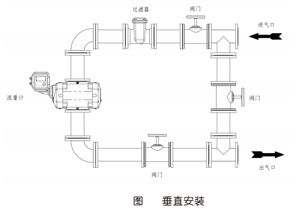 (4)為保證流量計(jì)正常運(yùn)行,必須在流量計(jì)上游安裝專用氣體過濾器;(5)為便于對(duì)流量計(jì)進(jìn)行后期維護(hù)和保養(yǎng),建議采用雙路設(shè)計(jì)或設(shè)置旁通管道;