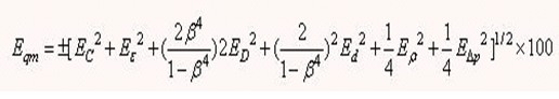 (1)式中;Eqm-流量相對不確定度,% ;EC,Eε,ED,Ed,Eρ,EΔp-分別為C,ε,D,d,ρ,Δp的相對不確定度,%;β-直徑比,無量綱。