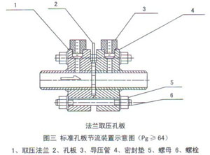 屬標(biāo)準(zhǔn)孔板。取壓方式為管道取壓。上游取壓孔中心位于孔板前面一倍管道內(nèi)徑處。下游取壓孔中心位于距離孔板后端為管道內(nèi)徑一半的地方。