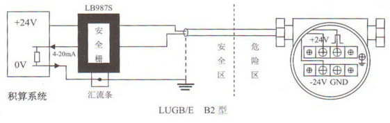 一、輸出頻率信號的三線制渦街流量儀表配線設(shè)計 渦街流量計輸出頻率信號的三線制流量傳感器采用DC24V或DC12V電源供電,一般通過三芯屏蔽電纜線(RWP3×0.5mm)與顯示儀表或計算機相連,屏蔽層應(yīng)可靠地接到放大器殼的接地螺絲上。屏蔽電纜線的選擇應(yīng)適合現(xiàn)場環(huán)境要求,另外屏蔽電纜線要與其它強功率電力線分離,不能平行走線。 二、輸出標(biāo)準(zhǔn)4~20mA電流信號的兩線制渦街流量儀表配線設(shè)計 輸出標(biāo)準(zhǔn)4~20mA電流信號的兩線制變送器采用DC24V電源供電,一般通過兩芯屏蔽電纜線(RWP3×0.5mm)與顯示儀表或計算機相連,屏蔽層應(yīng)可靠地接到放大器殼的接地螺絲上。屏蔽電纜線的選擇應(yīng)適合現(xiàn)場環(huán)境要求,外屏蔽電纜線要與其它強功率電力線分離,不能平行走線。 三、帶RS-485通訊接口功能的渦街流量儀表配線設(shè)計 帶RS-485通訊功能的渦街流量儀表采用DC24V電源供電,與其它設(shè)備之間采用四線制傳輸方式。 四、防暴型渦街流量儀表配線設(shè)計 LUGB/E三線制脈沖輸出型渦街流量儀表與LB978齊納安全柵相連、LUGB/E兩線制標(biāo)準(zhǔn)4~20mA電流輸出型渦街流量儀表與LB987S齊納安全柵相連可構(gòu)成本質(zhì)安全型防爆系統(tǒng),產(chǎn)品防爆標(biāo)志為Ex iaⅡCT2-T5。本安防爆型渦街流量傳感器/變送器與防爆安全柵和積算系統(tǒng)等關(guān)聯(lián)設(shè)備的接線性請參看防爆安全柵廠家提供的接線說明和以下所示圖。 注意事項: (1)防爆型傳感器和變送器安裝于危險場所,安全柵、顯示儀表、供電電源,計算機等關(guān)聯(lián)設(shè)備必須安裝在安全場所。 (2)傳感器和變送器應(yīng)有可靠接地,防爆地線不得與強電系統(tǒng)保護接地共用。