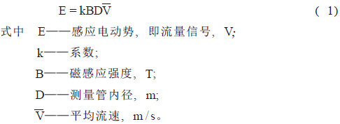 電磁流量計(jì)的基本原理是法拉第電磁感應(yīng)定律,即導(dǎo)體在磁場(chǎng)中切割磁力線運(yùn)動(dòng)時(shí)在其兩端產(chǎn)生感應(yīng)電動(dòng)勢(shì)。如圖1所示,導(dǎo)電性液體在垂直于磁場(chǎng)的非磁性測(cè)量管內(nèi)流動(dòng),與流動(dòng)垂直的方向上產(chǎn)生與流量成比例的感應(yīng)電勢(shì), 電動(dòng)勢(shì)的方向按弗來(lái)明右手規(guī)則,其值如下式:
