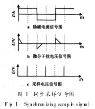 在現(xiàn)行的電磁流量計(jì)設(shè)計(jì)中,低頻矩形波勵磁方式結(jié)合了直流勵磁和交流勵磁兩者的優(yōu)點(diǎn), 成為主要勵磁方式之一。在低頻勵磁方式下, 其干擾主要表現(xiàn)為: 由勵磁電流突變產(chǎn)生的微分干擾信號[ 1] 。理想勵磁磁場信號為低頻矩形波, 實(shí)際上隨著勵磁電流變化 ( dI /dt)在磁場上產(chǎn)生微分干擾信號, 隨著電流的穩(wěn)定, 干擾信號隨之消失, 因此同步采樣技術(shù)可以有效抑制微分干擾信號。實(shí)際設(shè)計(jì)中, 模數(shù)轉(zhuǎn)化器使用 AD 公司的 24位 Sigma Delta模數(shù)轉(zhuǎn)化器 AD7714。 AD7714 可以分別采用硬件和軟件方式進(jìn)行采樣開始時間控制, 從而實(shí)現(xiàn)同步采樣。采用軟件方式時, 當(dāng)控制寄存器中FSYNC位為邏輯 1時, 模數(shù)轉(zhuǎn)換器處于復(fù)位狀態(tài); 向該位寫邏輯 0時, 器件開始采樣輸入信號。在應(yīng)用中,低頻勵磁信號由 M SP430單片機(jī)內(nèi)部定時器產(chǎn)生, 同時產(chǎn)生采樣信號。如圖 1所示, 采樣開始時間滯后勵磁信號14 個周期。