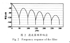式中: fs為采樣頻率; AD7714采樣頻率為 1912 kHz ; N為濾波采樣個數(shù); f 為數(shù)字濾波器響應(yīng)頻率。通過設(shè)定濾波采樣個數(shù)可以改變數(shù)字濾波器的截止頻率和一次陷波頻率。在本設(shè)計(jì)中綜合考慮模數(shù)轉(zhuǎn)換速度和去除噪聲性能, 設(shè)置 N 值使濾波器截止頻率為 50 Hz, 濾波器頻域響應(yīng)如圖 2所示, 濾波器對工頻 50 Hz及其偶次諧波有很好的抑制作用。