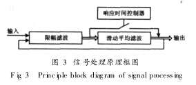 泥漿干擾是在測量泥漿、纖維漿等固液兩相特性液體時, 固體顆;蛘邭馀菖c電極發(fā)生摩擦, 在電極表面的電化學(xué)電動勢突然變化, 電磁流量計(jì)傳感器輸出信號輸出尖峰脈沖狀干擾。在低頻勵磁情況下, 泥漿干擾產(chǎn)生的尖脈沖數(shù)量級大, 極大地影響流量的準(zhǔn)確測量,在實(shí)際設(shè)計(jì)中,采用多種信號處理混合方式抑制噪聲,信號處理原理如圖 3所示。
