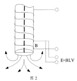管道式電磁流量傳感器的測量原理是基于法拉第電磁感應(yīng)定律(見圖 1 ),在與測量管道軸線和磁場磁力線相互垂直的管壁上安裝一對檢測電極, 當(dāng)導(dǎo)電液體沿測量管軸線運動時,導(dǎo)電液體作切割磁力線運動產(chǎn)生感應(yīng)電勢,此感應(yīng)電勢由測量管上的兩個電極檢出,數(shù)值大小為: