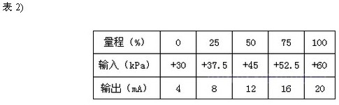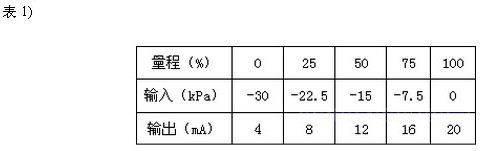 調(diào)校時(shí),正壓室接輸入信號,負(fù)壓室通大氣。假設(shè)儀表量程仍為30kPa,遷移量ρgh=30kPa。 輸入與輸出的關(guān)系見表2)。