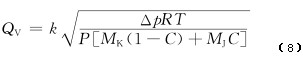 0 引言 針對(duì)瓦斯抽放管道中流量計(jì)量裝置不同的安裝環(huán)境,目前煤礦使用的流量計(jì)主要有差壓式V錐流量計(jì)和威力巴流量計(jì)、熱線式流量計(jì)。差壓式V錐流量計(jì)和威力巴流量計(jì)需要配置信號(hào)處理儀表,但市場(chǎng)上配置的信號(hào)處理儀表只能采集1個(gè)差壓信號(hào)用于計(jì)算瓦斯抽放管道流量,且沒有考慮環(huán)境條件變化對(duì)流量的影響,不能進(jìn)行實(shí)時(shí)補(bǔ)償,造成流量測(cè)量結(jié)果誤差較大。鑒此,一種具有動(dòng)態(tài)補(bǔ)償?shù)?strong>差壓式瓦斯抽放流量?jī)x表,可同時(shí)測(cè)試管道差壓、管道負(fù)壓、環(huán)境絕壓、管道溫度、管道瓦斯?jié)舛?個(gè)環(huán)境參數(shù),并對(duì)管道瓦斯流量測(cè)量進(jìn)行實(shí)時(shí)補(bǔ)償,提高了流量測(cè)量的準(zhǔn)確性。 1 測(cè)量原理及補(bǔ)償方法 1.1 傳感器測(cè)量原理 差壓式V錐流量計(jì)和威力巴流量計(jì)是由傳感器和信號(hào)處理儀表組成的測(cè)量裝置。傳感器產(chǎn)生一個(gè)依據(jù)流量大小而變化的差壓。具有動(dòng)態(tài)補(bǔ)償?shù)牟顗菏酵咚钩榉帕髁績(jī)x表采集相應(yīng)管道差壓、管道負(fù)壓、環(huán)境絕壓、管道溫度和管道瓦斯?jié)舛?個(gè)環(huán)境參數(shù),用于計(jì)算流量。常用的差壓式流量計(jì)體積流量計(jì)算公式為 式中:QV為體積流量;k為傳感器的結(jié)構(gòu)系數(shù);Δp為傳感器檢測(cè)的差壓;ρ為被測(cè)介質(zhì)的密度。 在實(shí)際生產(chǎn)和測(cè)試中,k,Δp和ρ都可能造成不同程度的測(cè)量誤差。其中k取決于結(jié)構(gòu)加工精密度,出廠前通過水流量計(jì)量裝置實(shí)流標(biāo)定確定;Δp取決于差壓傳感器精度,出廠前精度通過壓力計(jì)量標(biāo)校裝置標(biāo)校;ρ取決于現(xiàn)場(chǎng)測(cè)試介質(zhì)狀態(tài),需要根據(jù)介質(zhì)狀態(tài)的變化進(jìn)行實(shí)時(shí)動(dòng)態(tài)補(bǔ)償。 瓦斯抽放管道內(nèi)氣體壓力變化范圍一般為-80~20kPa,溫度變化范圍為0~40℃。管道內(nèi)氣體一般由空氣、CH4及其他烷類氣體組成,空氣和CH4比例占99%以上,因此瓦斯抽放管道內(nèi)其他氣體組分幾乎可以忽略不計(jì),但空氣和CH4的組分比例在不停變化。由此可見,介質(zhì)密度動(dòng)態(tài)補(bǔ)償需要從氣體壓力、溫度和濃度3方面來考慮。 1.2 儀表補(bǔ)償方法 理想氣體狀態(tài)方程: 式中:P為絕壓;V為體積;n為物質(zhì)的量;R為比例常數(shù);T為溫度。 摩爾質(zhì)量計(jì)算公式: M=m/n (3) 式中:M為摩爾質(zhì)量;m為質(zhì)量。 密度計(jì)算公式: ρ=m/V (4) 由式(2)—式(4)可得 ρ=PM/RT (5) 由式(1)和式(5)可得 由于管道內(nèi)氣體主要由CH4和空氣組成,所以混合氣體的摩爾質(zhì)量為 M=MK(1-C)+MJC (7) 式中:MK為空氣的摩爾質(zhì)量;MJ為CH4的摩爾質(zhì)量;C為管道氣體中CH4比例。 由式(6)和式(7)可得
