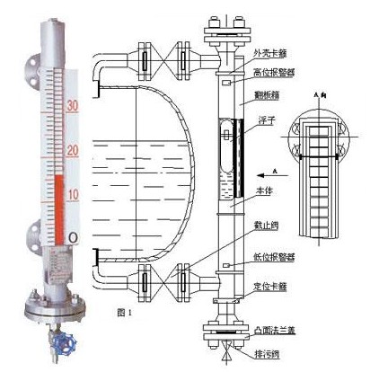 首先,讓我們來了解一下磁翻板液位計(jì)的結(jié)構(gòu):每一臺磁翻板液位計(jì)都有一個(gè)容納浮球的腔體,稱為主體管或外殼,它通過法蘭或其他接口與容器組成一個(gè)連通器;這樣它腔體內(nèi)的液面與容器內(nèi)的液面是相同高度的,所以腔體內(nèi)的浮球會隨著容器內(nèi)液面的升降而升降;在腔體的外面裝了一個(gè)翻柱顯示器,因?yàn)槲覀冊谥圃旄∏驎r(shí)在浮球沉入液體與浮出部分的交界處安裝了磁鋼,它與浮球隨液面升降時(shí),它的磁性透過外殼傳遞給翻柱顯示器,推動(dòng)磁翻柱翻轉(zhuǎn)180°;由于磁翻柱是有紅、白兩個(gè)半圓柱合成的圓柱體,所以翻轉(zhuǎn)180°后朝向翻柱顯示器外的會改變顏色,兩色交界處即是液面的高度。