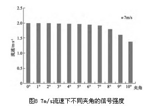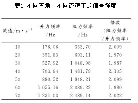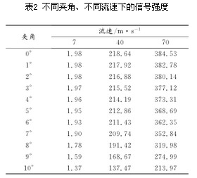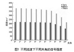 通過(guò)仿真模擬,圖4給出流速u(mài)=5m/s時(shí),作用在三角柱上的升力系數(shù)和阻力系數(shù)變化曲線(xiàn)。由圖5升力系數(shù)的FFT曲線(xiàn)可以看出其頻率為FL=87.92Hz。從圖6阻力系數(shù)的FFT曲線(xiàn)可以看出其頻率為FD=176.43Hz,約為升力系數(shù)變化頻率的2倍。 為了驗(yàn)證將FLUENT用于渦街流量計(jì)的三維流場(chǎng)仿真的可行性,對(duì)不同流速下的升、阻力頻率進(jìn)行比較,如表1所示?梢钥闯鲎枇ο禂(shù)變化頻率是升力系數(shù)變化頻率的2倍,說(shuō)明用FLUENT進(jìn)行渦街流量計(jì)的三維仿真是可行的。 4 仿真結(jié)果 基于上述通過(guò)升、阻力變化頻率的關(guān)系驗(yàn)證出利用FLUENT對(duì)三維渦街流場(chǎng)進(jìn)行仿真是可行的。本節(jié)應(yīng)用FLUENT對(duì)截流夾角、流速和信號(hào)強(qiáng)度之間的關(guān)系進(jìn)行了仿真研究。分別取7m/s、40m/s和70m/s的流速α的角度在0°~10°范圍內(nèi)取值(發(fā)生體的安裝偏差一般不會(huì)超過(guò)10°),進(jìn)行數(shù)值仿真。記錄信號(hào)強(qiáng)度,如表2所示。 將表2的數(shù)據(jù)繪制成圖7,將圖7中流速為7m/s的數(shù)據(jù)放大如圖8所示。觀(guān)察圖7、8,可以直觀(guān)的反應(yīng)出夾角、流速與信號(hào)強(qiáng)度的關(guān)系變化。通過(guò)對(duì)比這3張圖可以看出,信號(hào)強(qiáng)度隨著夾角、流速的不同而不同。并從圖中得出結(jié)論: 1)渦街的信號(hào)強(qiáng)度與流速成正比,隨著流速的增加,旋渦脫落頻率信號(hào)強(qiáng)度會(huì)顯著增加。 2)在流速相同的情況下,隨著夾角的增大,信號(hào)強(qiáng)度逐漸減小,并隨著夾角的增大,信號(hào)強(qiáng)度的衰減程度也逐漸增大。夾角在1°~7°范圍,對(duì)信號(hào)強(qiáng)度的衰減影響不大,可忽略,超過(guò)7°以后對(duì)信號(hào)強(qiáng)度影響變大,不可忽略。 3)在夾角相同的情況下,隨著流速的增大,信號(hào)強(qiáng)度衰減趨勢(shì)越來(lái)越明顯。 5 結(jié)論 流場(chǎng)仿真在渦街流量計(jì)的設(shè)計(jì)和完善中正變得越來(lái)越重要,它通過(guò)理論支持指導(dǎo)仿真的可實(shí)施性,并將仿真結(jié)論用于實(shí)驗(yàn)中,提高效率。通過(guò)模擬三維渦街流場(chǎng)三角柱繞流現(xiàn)象,將升、阻力頻率進(jìn)行對(duì)比,驗(yàn)證了可將FLUENT用于三維渦街流場(chǎng)的仿真中。并從不同流速和不同截流夾角兩方面分別考慮,對(duì)比分析了三維渦街信號(hào)的信號(hào)強(qiáng)度,得出夾角在1°~7°范圍,對(duì)信號(hào)強(qiáng)度的影響不大,超過(guò)了7°以后影響變大。從而為以后的實(shí)驗(yàn)做出理論指導(dǎo)。進(jìn)一步的研究可以通過(guò)對(duì)不同形狀的旋渦發(fā)生體取不同截流夾角和不同流速進(jìn)行仿真對(duì)比研究。