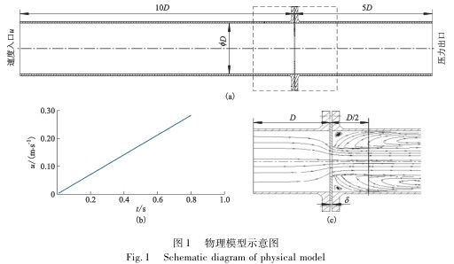 圖1為孔板流量計(jì)的物理模型示意.根據(jù)標(biāo)準(zhǔn)孔板流量計(jì)的安裝,圖1a中,上下游直管段長分別取10D和5D作為穩(wěn)定直管段.其中上下游管內(nèi)徑D取100mm,孔板厚度δ取3mm.