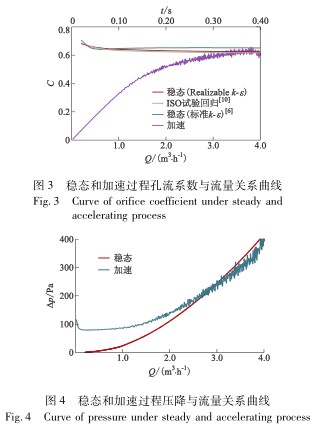 對(duì)于流量Q≤0.6m3/h,C0隨流量的增加緩慢下降,之后保持在0.63左右.與C0不同的是,C從0開始隨流量的增大而增大,并逐漸向C0靠近,直至Q≥3.5m3/h后才達(dá)到C0的水平.C在時(shí)間上滯后于C0.圖4中△p-Q曲線顯示,Q≤3.0m3/h時(shí),加速過程孔板前后壓降高于同等流量下穩(wěn)態(tài)壓降;Q≥3.0m3/h后,瞬態(tài)壓降才降為穩(wěn)態(tài)水平.