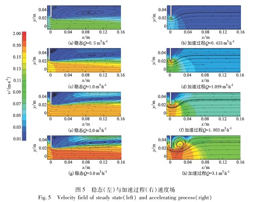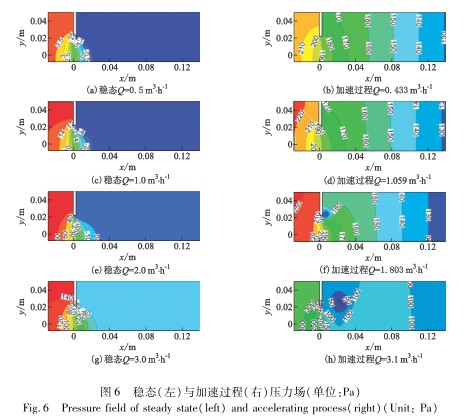 從內(nèi)流角度分析導(dǎo)致第2.1節(jié)中C和C0不同的原因,圖5和圖6分別給出并對(duì)比了相同流量下穩(wěn)態(tài)和加速過程中流經(jīng)孔板前后流體的速度和壓力場.對(duì)于Q≤3.0m3/h穩(wěn)態(tài)條件,孔板后方始終可觀察到一個(gè)被拉長的主渦和孔板右上方的小渦,流動(dòng)的損失較大,同時(shí)表明流場中已形成穩(wěn)定的流動(dòng)通道,動(dòng)能和壓能的轉(zhuǎn)化已達(dá)到平衡,流動(dòng)的損失(長漩渦)也趨于穩(wěn)定,并且壓差隨流量的增大而穩(wěn)定增大.