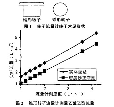 轉(zhuǎn)子流量計(jì)常見(jiàn)的轉(zhuǎn)子形狀如圖1所示,左邊圖形的轉(zhuǎn)子用廣泛,為錐形轉(zhuǎn)子;右邊的圖形為圓珠形,為球形轉(zhuǎn)子。用這兩種轉(zhuǎn)子流量計(jì),經(jīng)過(guò)測(cè)量,得到下列較為幾個(gè)典型的圖例。在錐型轉(zhuǎn)子流量計(jì)中,粘度為0.52mpa.s、密度為900kg·m-3’的液體乙酸乙醋的實(shí)測(cè)結(jié)果見(jiàn)圖2,粘度為1.gmPa·s、密度為1050kg·m-3的丁內(nèi)醋的實(shí)測(cè)結(jié)果見(jiàn)圖3,圖中所示的密度修正流量曲線指的是僅以密度進(jìn)行修正的曲線,其修正公式為。