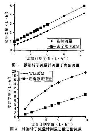 用球形轉(zhuǎn)子流量計(jì)測(cè)量乙酸乙醋的結(jié)果見(jiàn)圖4,由圖可知,球形轉(zhuǎn)子流量計(jì)的這種類(lèi)型,粘度對(duì)其的影響非常之大,且實(shí)際流量的線性度也極差。所以在實(shí)驗(yàn)中絕對(duì)不可忽視粘度對(duì)示值的影響。