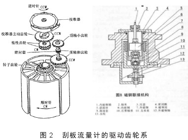 (4)出軸密封部分:出軸密封部分是連接流量計(jì)表頭和流量計(jì)殼體的部分,它一般有三種結(jié)構(gòu):磁性連軸器、機(jī)械密封式的連接、“O”型密封圈式的連接。這里我們主要分析以磁性聯(lián)軸器為連接的結(jié)構(gòu)易出現(xiàn)的故障。磁性聯(lián)軸器脫磁,包括打滑,溫度升高,都非常容易引起脫磁。無(wú)法轉(zhuǎn)動(dòng),就帶動(dòng)不了精度修正器轉(zhuǎn)動(dòng),那么依次向上,也就不發(fā)生轉(zhuǎn)動(dòng)。出軸密封的聯(lián)軸器脫磁,不能發(fā)生轉(zhuǎn)動(dòng),帶動(dòng)上面的精度修正器里面的齒輪也不發(fā)生轉(zhuǎn)動(dòng),所以字輪也不再轉(zhuǎn)動(dòng)(圖2)。