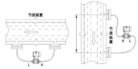 對(duì)不能用導(dǎo)壓管引出的介質(zhì),可用雙法蘭差壓變送器進(jìn)行流量測(cè)量,其裝置見下圖,測(cè)量水平管道時(shí),兩法蘭同在一水平面上,不存在液位差,不考慮遷移,測(cè)量垂直管道是,始終承受(r-r0)H的液位壓差故儀表應(yīng)有(r-r0)H正遷移量。