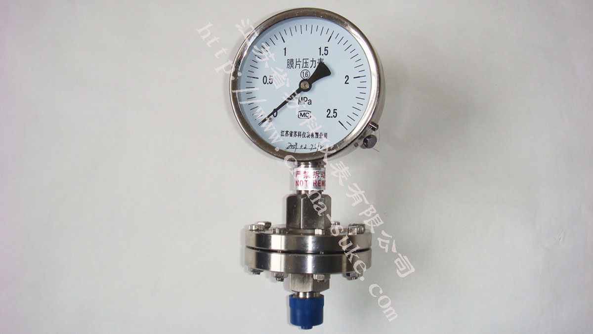 膜片壓力表的作用原理是基于彈性元件(測(cè)量系統(tǒng)上膜片)變形。膜片壓力表在被測(cè)介質(zhì)的壓力作用下,迫使膜片產(chǎn)生相應(yīng)的彈性變形---位移,借助連桿組經(jīng)傳動(dòng)機(jī)構(gòu)的傳動(dòng)并予放大,由固定于齒輪上的指針逐將被測(cè)值在度盤上指示出來(lái)。